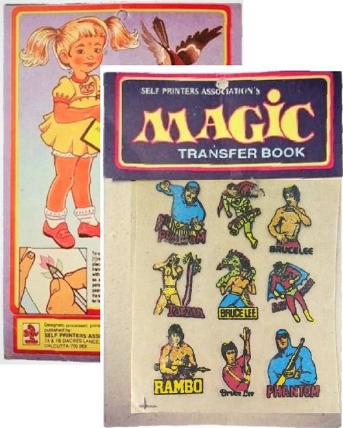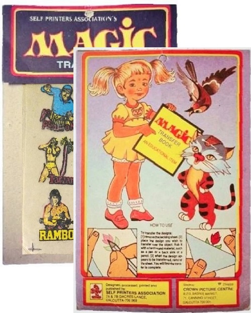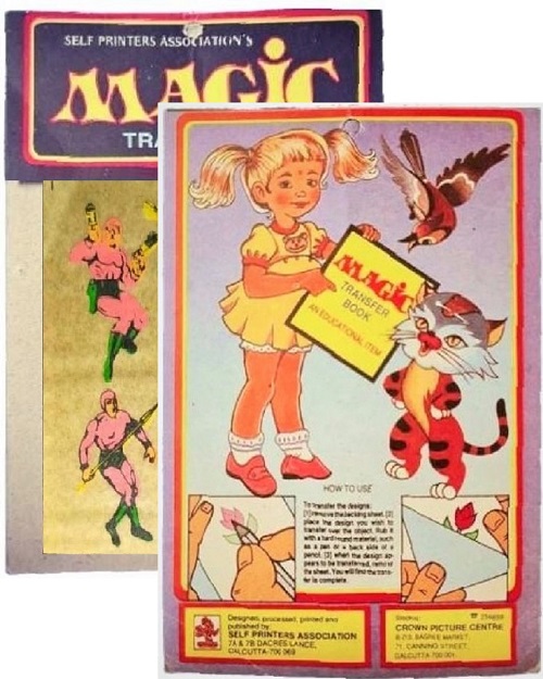 The Magic Transfer Book series was produced by Self Printers Association in India between 1985 and 1989. The Magic Transfer Book packs are a group of various character transfer sheets stapled to a 11” x 5” backing board. The backing board was folded at the top to form a flip over header card, with the rear of the pack containing an instruction guide.