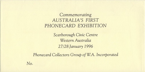We see additional information on this version on the inside, as they were issued at Australia’s first ‘Phonecard Exhibition’ in Scarborough, Australia in January 1996. Each folder is individually numbered at the bottom right and are limited to 500 worldwide. This version was presented to the attendees of the Exhibition in an envelope, which is also numbered, on the bottom left, matching with the folder number within.