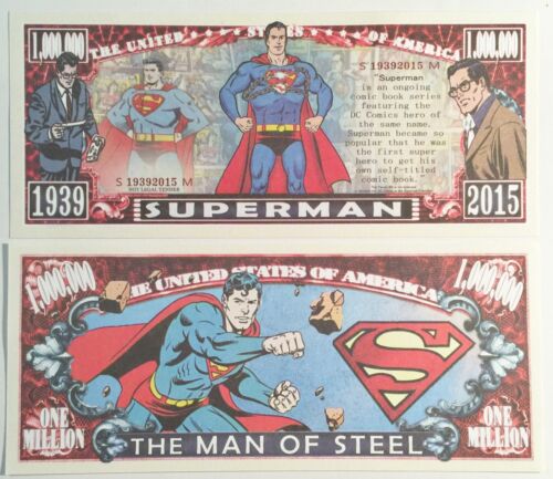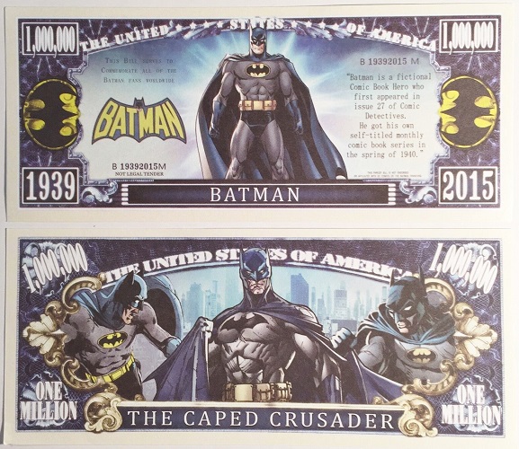 A variety of comic book characters feature on Novelty Bank Notes, generally those licensed to Marvel or DC, with a similar design followed as seen on the Phantom Novelty Bank Note. A very small sample can be seen below featuring Batman, Spider Man and Superman.