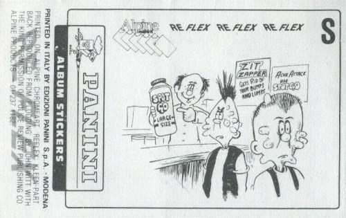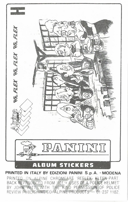 The back of the 87 Panini Promotional Stickers produced in Italy contain a large letter from the alphabet, plus an illustration from either ‘Plodding’ or ‘101 uses of a Police Helmet’ cartoons by John Witt (published with the permission of the Police Review Publishing Co). 40 varying illustrations are features, some appearing twice in the set of stickers. Those not featuring a letter and a illustration contain a Alpine Products U.K. advertisement or promotional offer. An example of a stick back can be seen below.