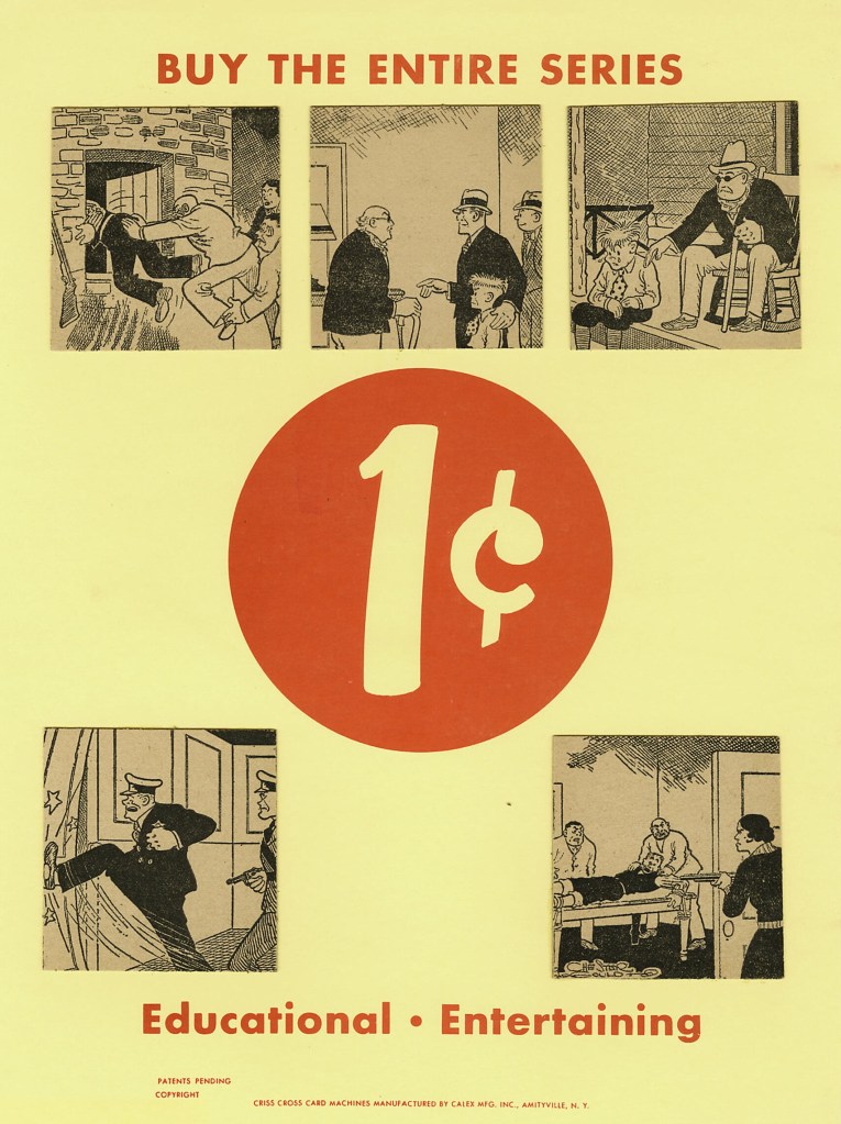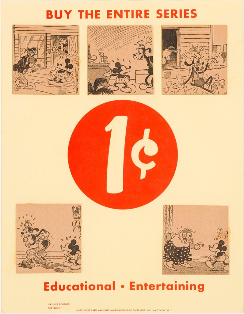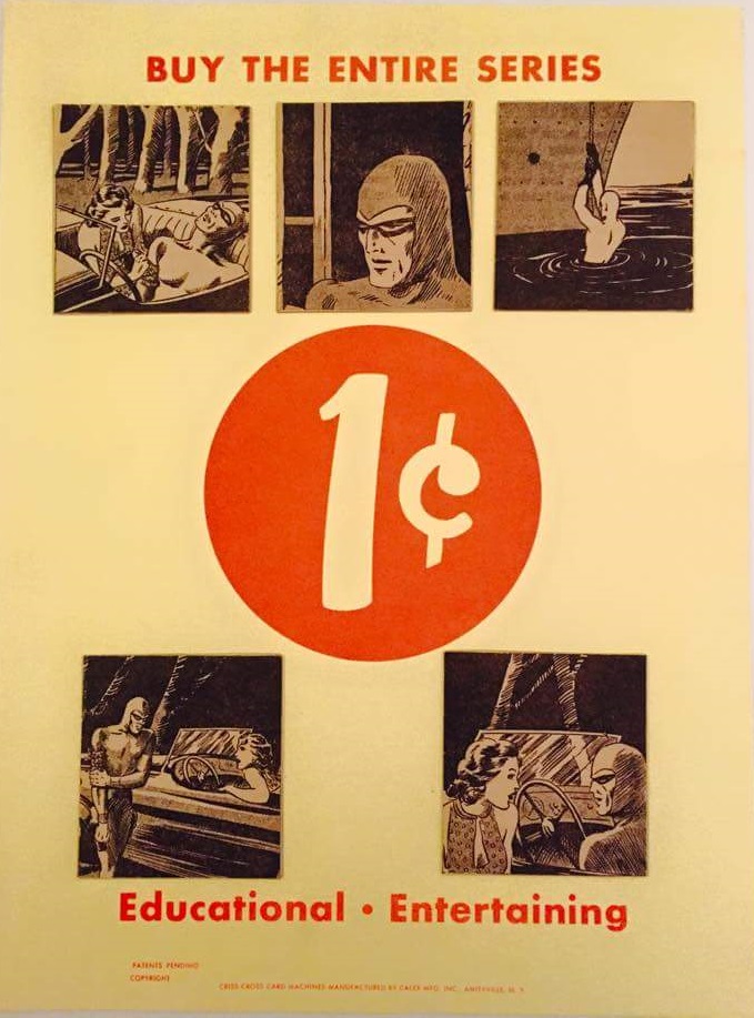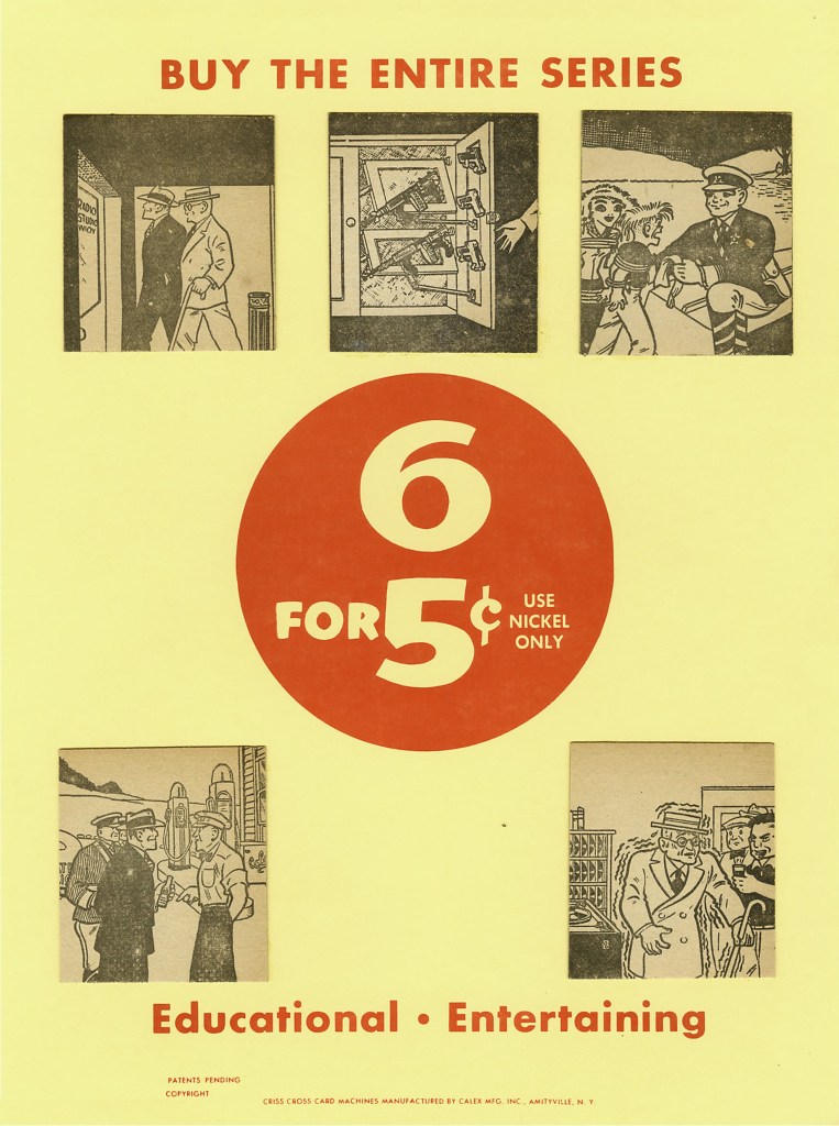 The Penny Cards were dispensed from a Criss Cross Card vending machine which was produced by Calex MFG. Inc. A poster was placed in the machine to advertise the characters available at the gas station. Actual Penny Cards were glued to the posters to entice the general public to make a purchase.