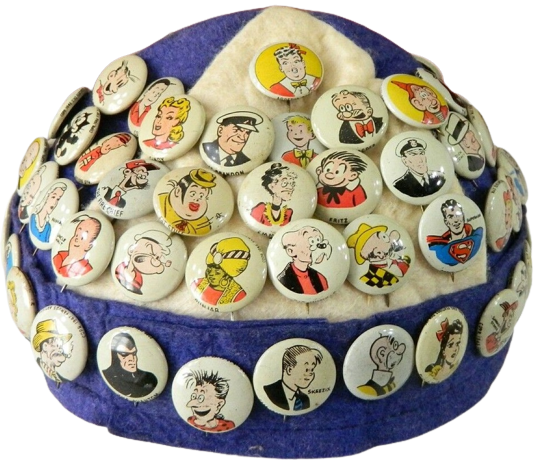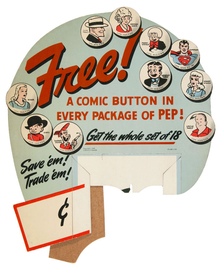 In 1945, 1946 and 1947, the Kellogg Company inserted a give-away collectible in the form of pinback buttons into specially marked boxes of PEP cereal. PEP pins included U.S. Army squadrons as well as comic book characters published in newspapers at the time. Below we see an example of a PEP cereal box promoting the buttons.
