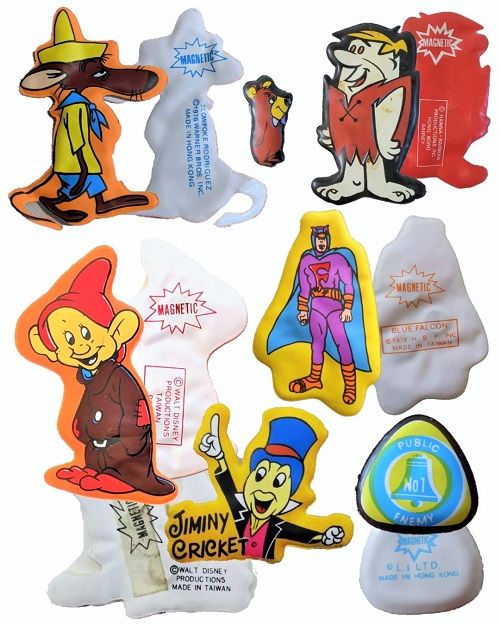It appears that Al Nyman & Son, Inc., must have acquired licenses from at least 5 companies; © K.F.S, © Walt Disney Productions © Hana – Barbara Productions Inc., also known as ©H.B.P Inc, © Warner Bros, Inc. and © L.I. LTD. Each puffy magnet bears the name of character/topic, as well as the copyright business.