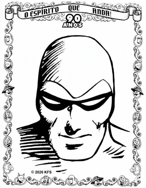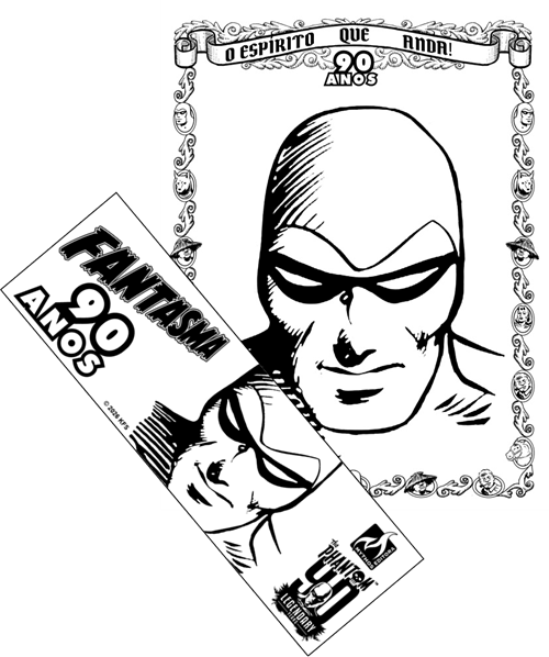 The Bookplate features a decorative boarder with characters seen as found in Phantom comic strips including the Phantom, Diana, Guran, Colonel Weeks, Hero and Devil. The words ‘O Espirito Que Anda!’ (which translates to ‘The Spirit That Walks!’) and ’90 Anos’ (which translates to ’90 Years’) can also be seen.