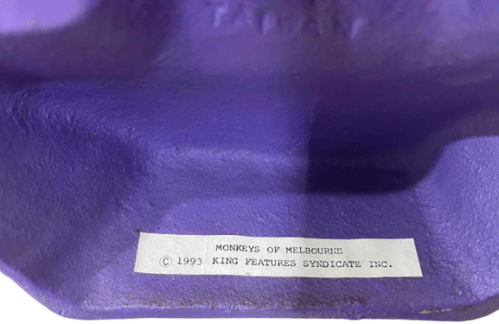 A sticker is located on the reverse side, within the lower part of the Door Stop, noting copy right information, ‘Monkeys of Melbourne’ and ‘King Features Syndicate Inc.’ and the year of production, 1993.