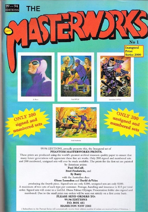 The Phantom Masterworks Print Set 1 were first advertised on the inside back cover of Frew Publications Phantom comic book number 1279, in 2000.