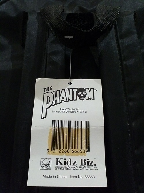 A retail cardboard tag is attached to the carry strap at the rear of the Backpack Bag containing imagery from the Phantom movie plus licensing information. We also see the Kidz Biz logo and a barcode to be used by the retail outlet.