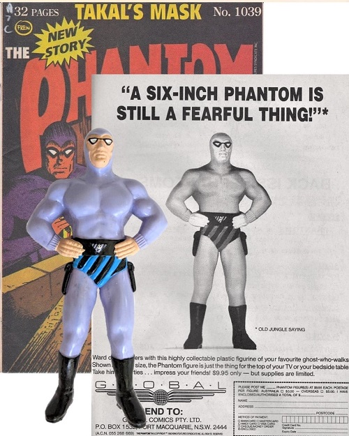 The first time we see the Australian purple PVC version advertised by Global Comics Pty, Ltd was on the inside back cover of the Australian Frew Publications Phantom comic number 1039, in April 1993.