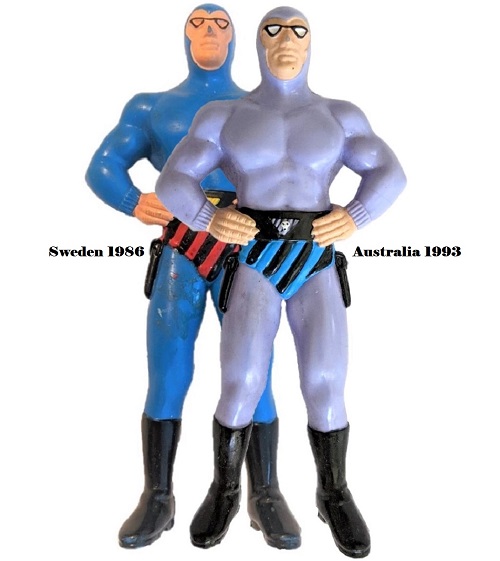 The figure is based on the 1986 blue Swedish Phantom PVC figure. In 1993, ‘Bulls’ Sweden (the sole licensee for Swedish Phantom produced merchandise) supplied ‘Global Comics Pty, Ltd’ with a pre painted purple 6” PVC figure, which was identical to the Swedish blue PVC figure first produced in 1986, however there are no dates or copyright trade marks on the Australian figure.