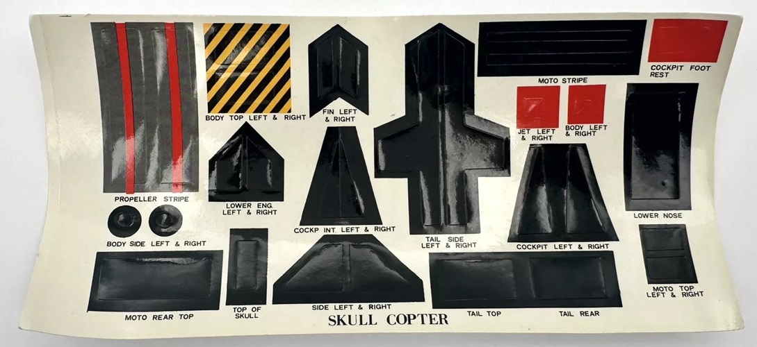 A sticker sheet was included, requiring the new owner of the Phantom Skull Copter to affix the sticker decals onto the toy as instructed. This sticker sheet is illustrated below, with notations positioned adjacent to each uniquely shaped sticker indicating the appropriate location for application.