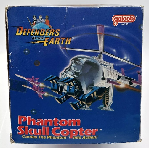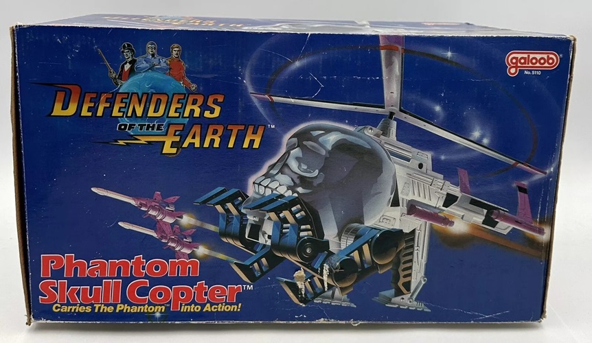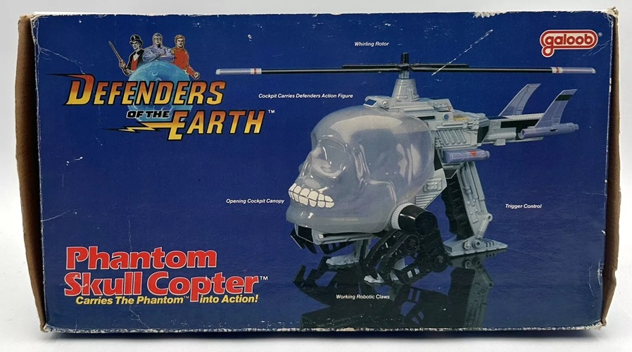 The Phantom Skull Copter constitutes an integral component of a toy series introduced by Lewis Galoob Toys, Inc., which featured articulable figures and vehicles inspired by the Defenders of the Earth animated series. In the context of the cartoon, the Skull Copter was utilized solely by the Phantom and is not depicted in the stories of the Phantom comic strip.