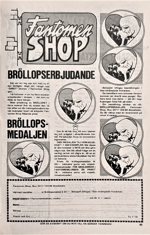 On the 14th of March, 1978 Fantomen comic book number 6 (the edition prior to the medallion advertisement) published the Phantoms Wedding story by Lee Falk and drawn by Sy Barry. The cover of this edition is illustrated by Rolf Gohs. This Fantomen comic book cover bears the same image as the medallion.