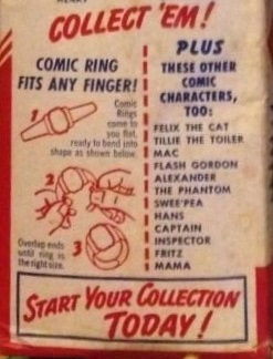 Part of a larger set of 24 rings, the Phantom ring was randomly inserted into the cereal boxes seen above as a free giveaway in 1949. The set featured various King Features Syndicate comic book characters, including Henry, Little King, Flash Gordon, Orphan Annie, Dick Tracy, and many more.