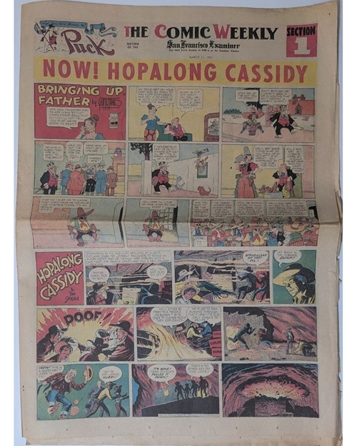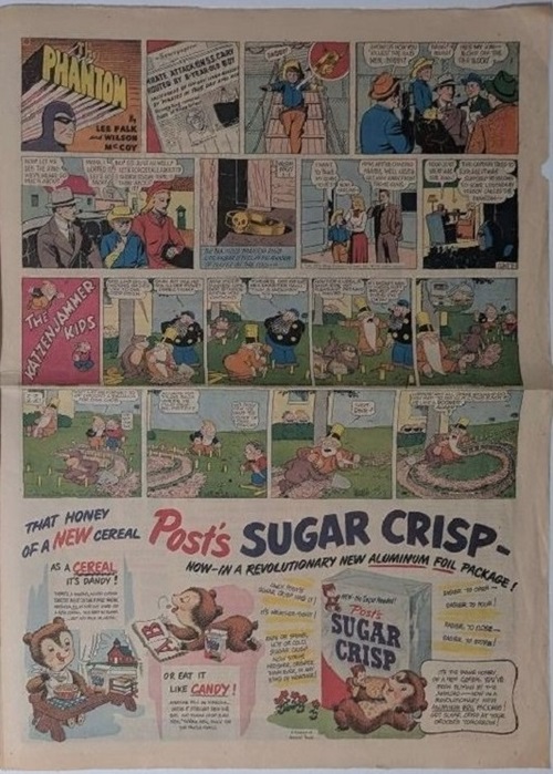 From 1931 to the 1970s, the Examiner’s Sunday comic section, ‘Puck – The Comic Weekly,’ delighted readers nationwide, showcasing popular King Features Syndicate’s comic strips like the Phantom which made its debut in 1950. Below is an example from March 1951, with the front page shown, plus an internal page featuring the Phantom comic strip as illustrated by Wilson McCoy.