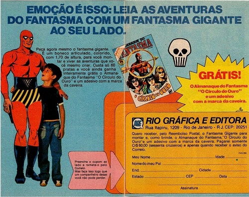 The Phantom Hang-Up was advertised in various Fantasma comic books published by RGE, generally on the outside back cover, at a cost of Cr$40,00. If purchased direct from RGE, the Hang-Up was posted in a blue 2-sided folder by RGE, with various sections folded to fit in the mailing envelope. Below we see an example of the advertisement on the back cover of Fantasma Especial No.3.
