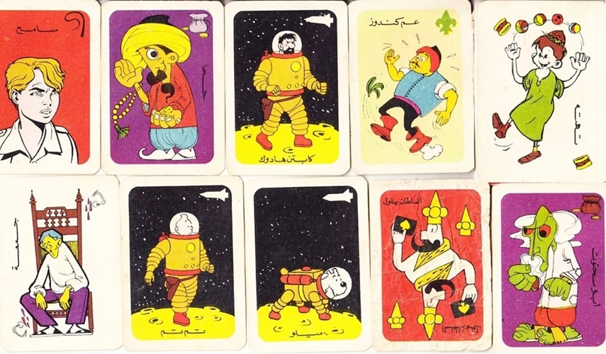The title of the card game set, ‘Samir’s Card’, is inscribed in Arabic on both sides of the cardboard box that encases the set. This box showcases a collection of comic book characters featured in the card set, prominently including the Phantom within the collage. Both sides of the box are uniquely colored, one side is red, whilst the second side is blue, with the same image and card game title seen on both sides.