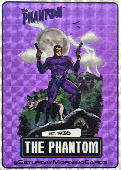 The Phantom sticker contains rounded corners and features a ‘pixel’ or ‘checkerboard’ holographic pattern across the highly reflective purple background, which is a signature style for limited-run trading card style stickers. The front of the sticker features an image illustrated by Erick Marshall, with the Phantom seen holding his twin pistols, with his faithful wolf companion Devil, and the iconic Skull Cave in the background.