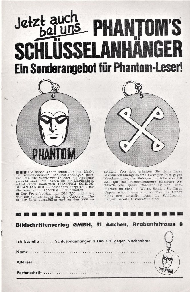 A year later we see this same key ring offered on the inside back cover of the Phantom comic book series released in Germany in issue number 15, 1968 and issue number 20, 1968. Note the wording on the German version of the key ring reads ‘Phantom’ and not ‘Fantomen’ as seen on the Swedish advertisement above.