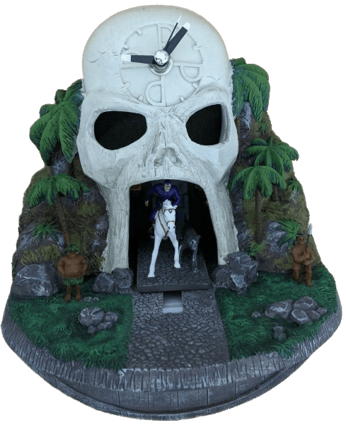 The Ghost Who Walks Clock is in the shape of the Phantoms home, the Skull Cave, in a Jungle setting. Each clock is hand-painted with the clock face containing the Phantoms Good ring mark, found on the forehead of the skull. We find Guran and a tribesman guarding the entrance of the Skull Cave, with even the Skull Throne visible from the entrance.