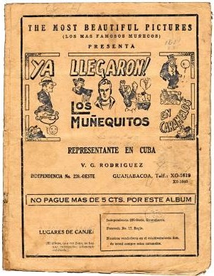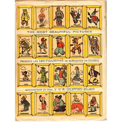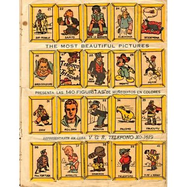 The Most Beautiful Pictures Presenta Los Muñequitos card album was released by V.G. Rodriguez in the municipality of Guanabacoa, Havana, Cuba in 1949. The card album features a variety of comic book characters popular in Sunday supplements of newspapers in Cuba at the time, including El Diario de la Marina, El Mundo and El País. A full set of cards is made up of 140, with an album released to attach the 140 paper cards, measuring 8.5” x 11”.