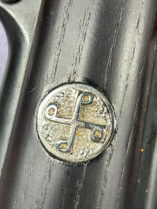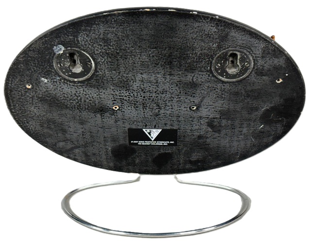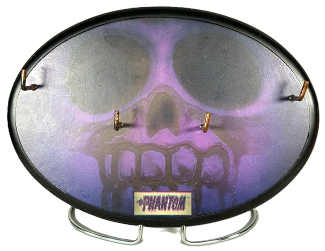The Phantom 1911 Colt Pistols came with a timber oval shaped display rack depicting a skull in purple on the front, with a plaque in the lower center reading ‘The Phantom’. The display rack was designed to either stand freely on a shelf or hung on a wall via a pair of precut holes at the rear. Brass hooks are located on the front of the rack for the pistols to be placed and displayed. A sticker can be seen on the back noting the production year and copyright information.