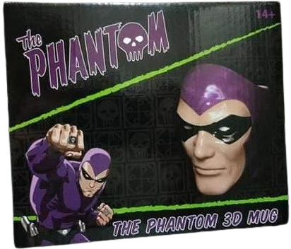 The Phantom 3D Mug was produced by Ikon Collectables in Australia in 2023. The ceramic mug contains a 3D image of the Phantoms head designed to be used as a regular hot drink drinking mug. The Phantom 3D Mug is fully licensed by King Features Syndicate.