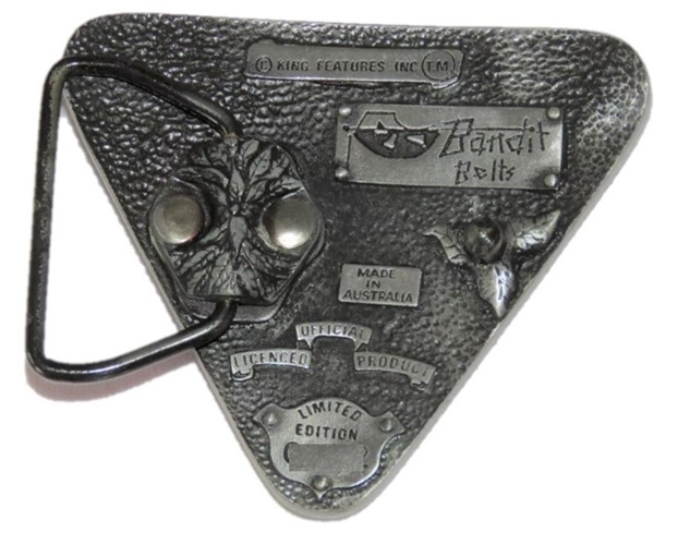 The Phantom Buckle and Belt were produced by Bandit Belts in Australia in 1989. This limited-edition item was initially available exclusively through mail order directly from Bandit Belts, with orders sent to P.O. Box 1134 Fitzroy North, Victoria 3068, Australia. The set is fully licensed by King Features Syndicate.