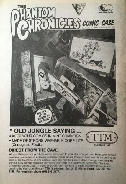 The Phantom Chronicles Comic Case were advertised within Phantom comic books published by Frew Publications, only available via mail order purchased direct with TTM Marketing. Below we see an example of an advertisement.