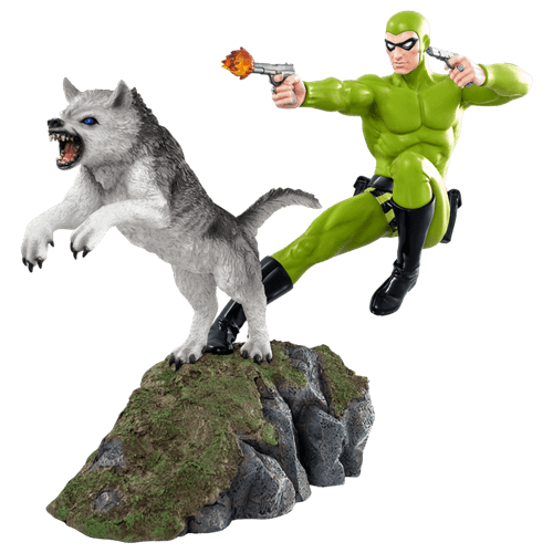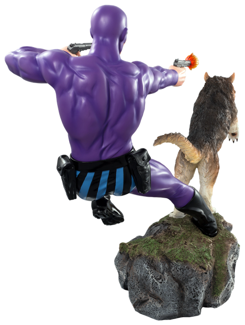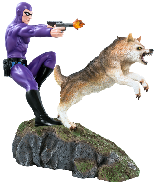 The Phantom & Devil Statue 1/6th scale diorama is a premium polystone statue capturing the Phantom in a moment of high-octane action. Unlike more static, traditional depictions, this piece features the Phantom vaulting over jungle terrain while dual-wielding his signature pistols. His loyal mountain wolf, Devil, is sculpted mid-leap beside him, creating a cohesive sense of movement that celebrates the inseparable bond between the two characters.