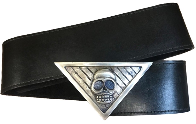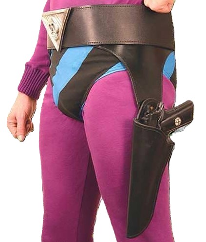 The Phantom Double Holsters were part of a set which included a belt, a belt buckle and a pair of detachable pistol holsters. The belt and pistol holsters are manufactured of heavy, top grain black leather. The triangular shaped large metal antiqued belt buckle is finished in a silver look with a skull in the center. The hidden side Velcro strips allow for easy adjustability of the belt for a variety of waist sizes. The belt, belt buckle and the detachable pistol holsters can be seen below, with the pistol not included in the set.