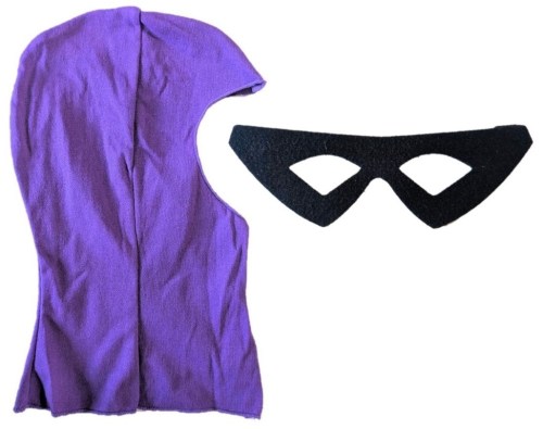 Inside, the adult-sized costume set includes a one-piece bodysuit, cowl, and trunks made from high-quality stretch fabric. The textured, flocked fabric eye mask is secured with an elastic head strap. The vinyl gun belt features a raised plastic silver buckle, adding to the overall aesthetic.