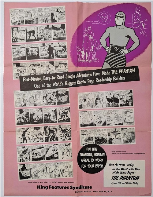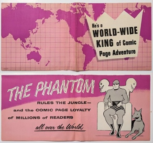 The Phantom Promotional Brochure, which doubled as a large poster, was exclusively distributed to a handpicked group of newspaper publishers and editors. It exemplifies King Features Syndicate remarkable marketing approach to promote the Phantom in syndicated newspapers throughout the United States.