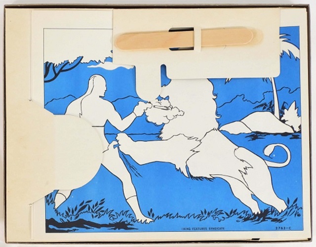 The Phantom Rub-Ons Magic Picture Transfers set was sold in a cardboard box with sticky tape holding the lift off lid closed, measuring 31.5cm x 24.5cm. The Phantom is seen sitting on the Skull Throne with Devil by his side. Also found on the lid is a pictorial description of what Rub-Ons are, ‘The Most Exciting Craft For Children Since Coloring’.