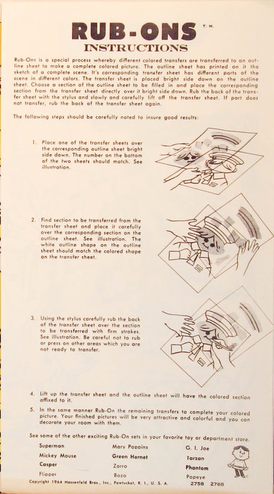Hassenfeld Bros, Inc produced a large variety of Rub-Ons sets in the 1960’s and 1970’s featuring a variety of characters and themes, including Superman, Mickey Mouse, Donald Duck, Batman, Bugs Bunny, Bonanza, Casper, Mary Poppins, Green Hornet, G.I. Joe, Daniel Boone, Mother Goose, Flipper, Tarzan, Cowboys & Indians, The Minsters, Popeye, Zorro, The Flintstones, Disneyland, Fashion and Krazy Kooks.