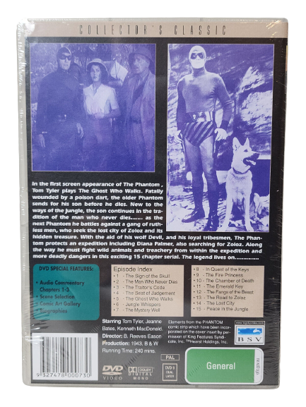 The first official Australian release of the 1943 Phantom Serial on DVD was in 2004. The dual layer disc contains all 15 chapters running for 240 minutes, the serial is presented in it’s original black and white format.