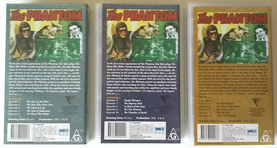 The first official Australian release of the 1943 Phantom Serial on VHS was in 1999. Spread across 3 VHS tapes, with 5 chapters appearing on each tape running for 90 minutes, the serial is presented in it’s original black and white format.