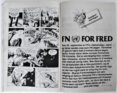 The ‘United Nations Day’ Stamp is a novelty stamp issued free of charge with Fantomet comic book number 22, 1977 in Norway.