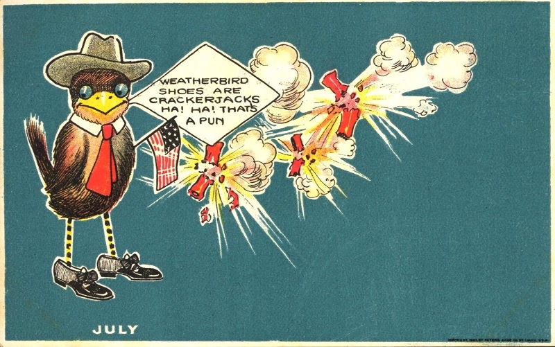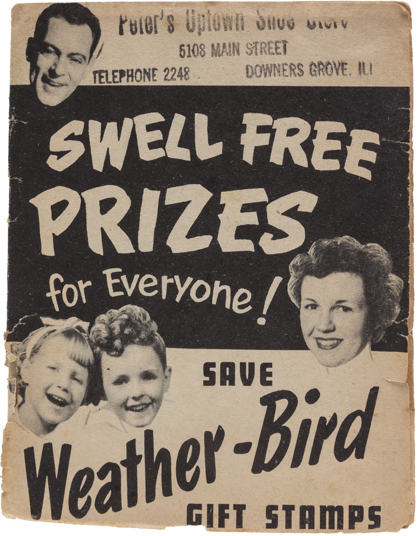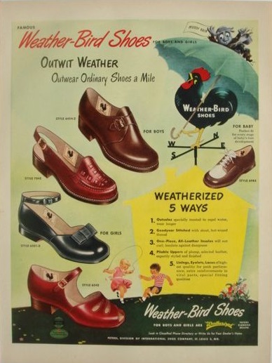 Peters Shoe Company was created by Henry William Peters in 1892 and merged in 1911 with the Roberts, Johnson and Rand Shoe Company. The Weather-Bird brand remained an integral part of their shoe product line. They produced many promotional items like whistles, visors, tin clickers comics and postcards. The Weather-Bird Shoe brand was eventually discontinued.