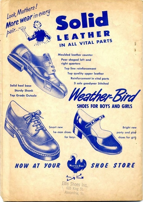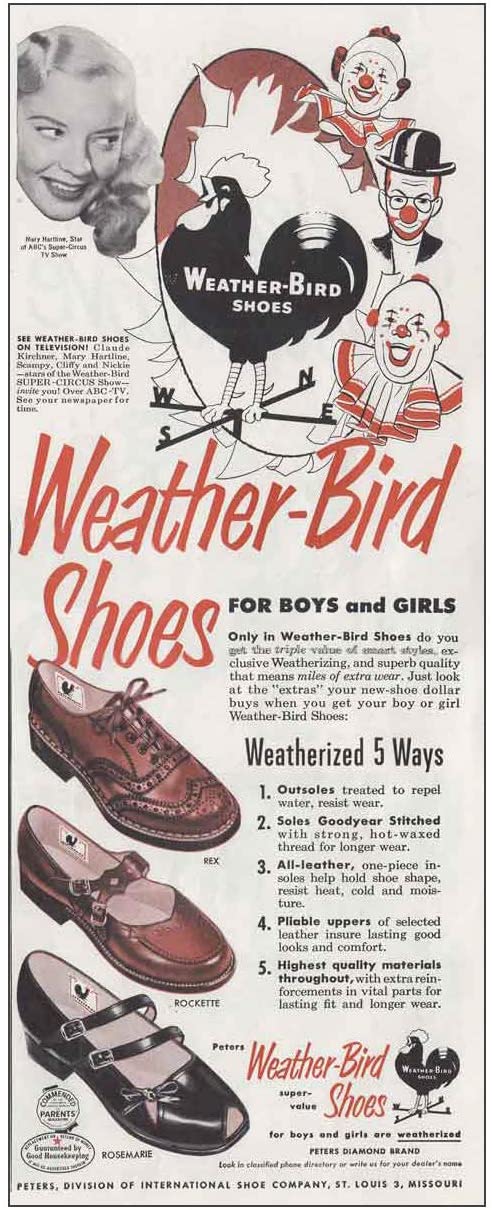 The Peters Shoe Company enlisted various bird mascots, including Poll Parrot, Red Goose, Buster Brown and Weatherbird to competed to win over kids and their parents for shoe purchases. Today, many collectors seek these rare vintage shoe advertisements that feature the colorful characters. The antique memorabilia with these mascots are amongst the most prized and always create entertaining conversation pieces.