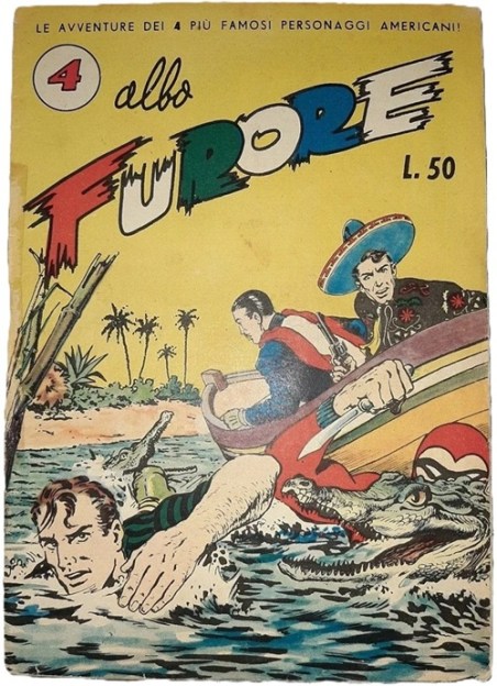 Albo Furore comic books were published on a weekly basis, with each edition containing 28 to 32 pages in a mix of color and black and white pages with color covers measuring 17cm x 24cm. The first 8 editions contain the text ‘Le Avventura Dei 4 Più Famosi Personaggi Americani’ on the header of the front covers, which translates to ‘The Adventures of the 4 Most Famous American Characters’. An edition number is also found on all front covers.
