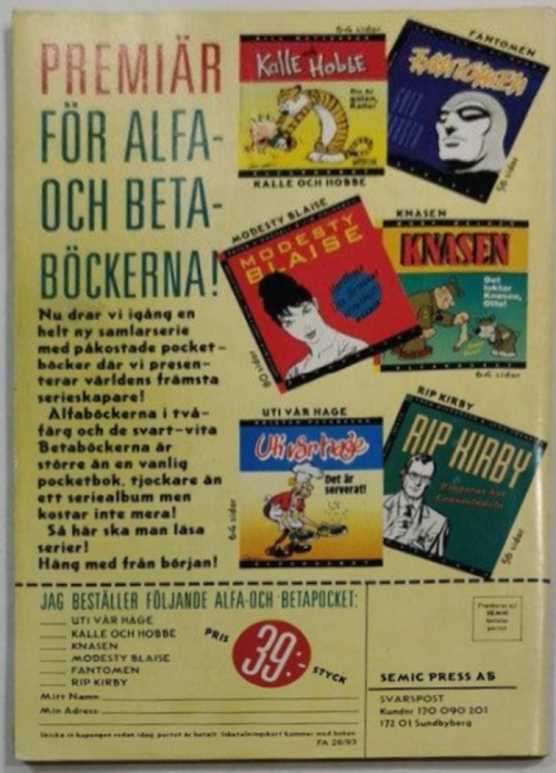 The Beta Pocket series is advertised in Fantomen comics by Semic Press. Below we see an advertisement found on the back cover of Fantomen edition number 26, 1993.