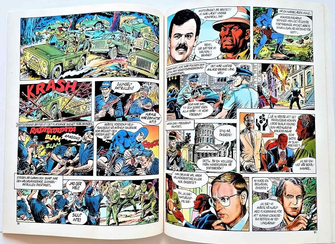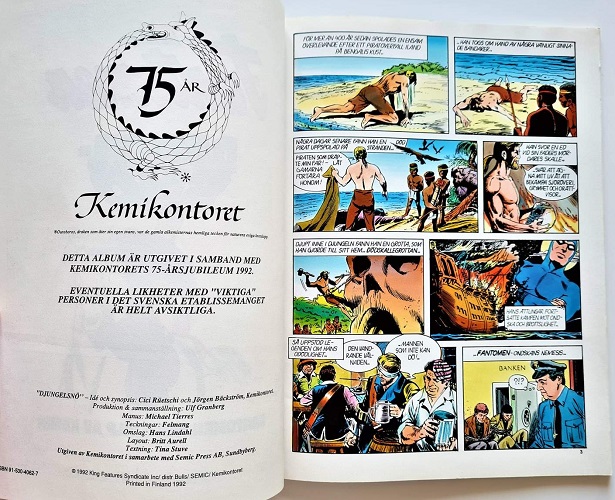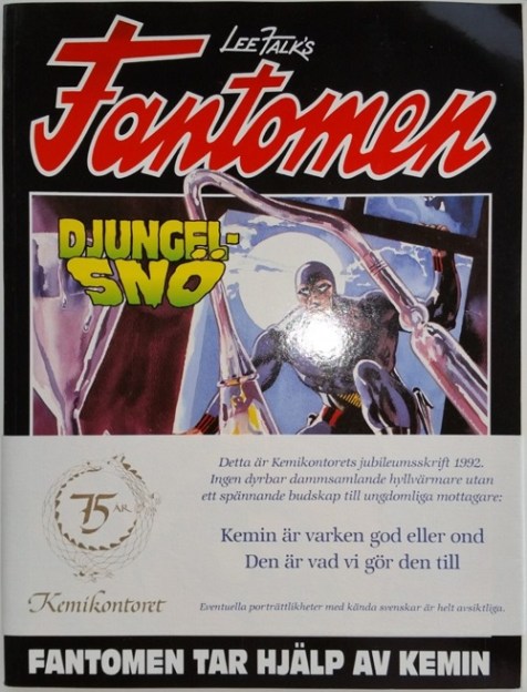 The Fantomen story Djungelsnö would later go on to be published in the regular series of Fantomen comics in Sweden in 1993, in edition number 13. The Hans Lindahl cover art was also used on this edition as found in the Kemikontoret 75th anniversary special edition above.