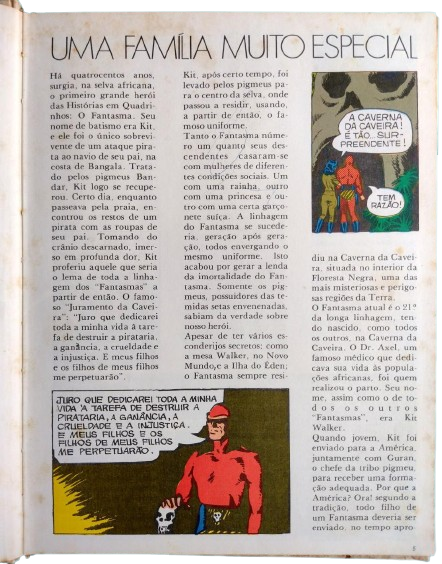An introduction is found at the front of the comic book titled ‘Una Família Muito Especial’ which translates to ‘A Very Special Family’ commencing from page 5. The introduction provides a detailed description of the origins of the Phantom with an overview of the Phantoms mythos as seen in his storylines.