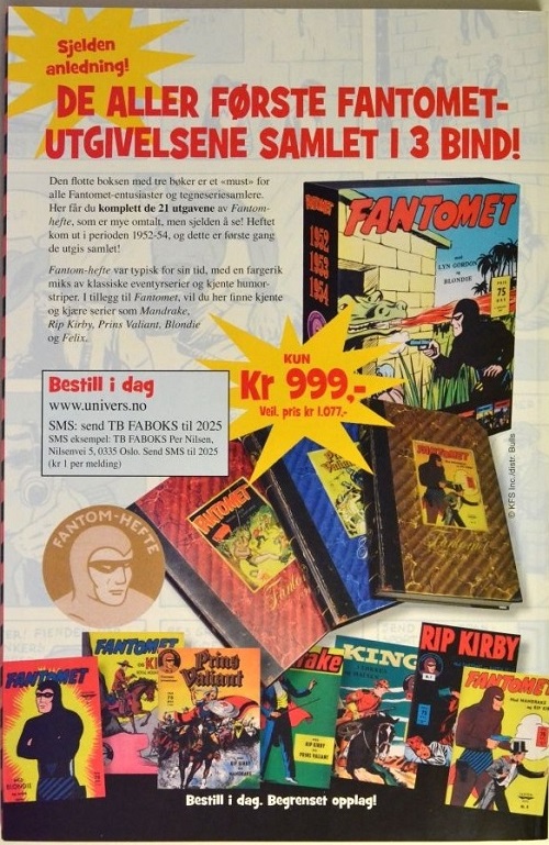 The Fantom-Hefte Komplett Samling was first introduced in Fantomet edition number 7-8, published in 2010. The exterior back cover features an advertisement for the three album-style books. These three albums were available for purchase individually or as a comprehensive bundle. As illustrated in the advertisement below, when offered as a bundle, a custom sleeve was included for the albums.