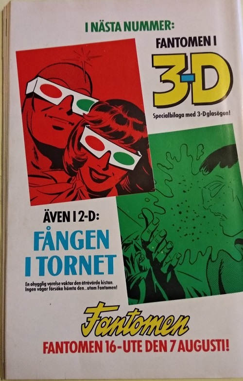We first see an advertisement for the 3D Comic Supplement advertised on the outside back cover of Fantomen comic book number 15, 1989. The Phantom and Diana are seen wearing 3D glasses, with a release date of the supplement also noted as the 7th of August.