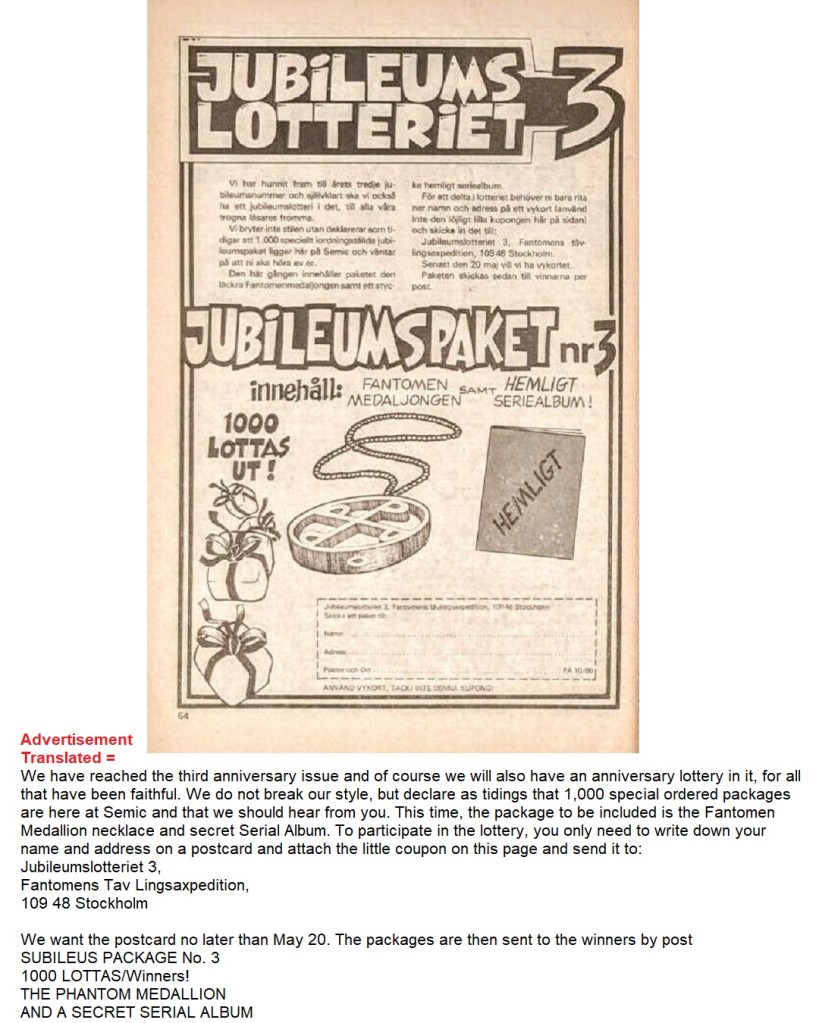 The ‘Jubilee Lottery 3’ contest was published in Fantomen comic book number 10 by Semic Press in Sweden in 1980. Below we see the comic book front covers that the contests were advertised in.