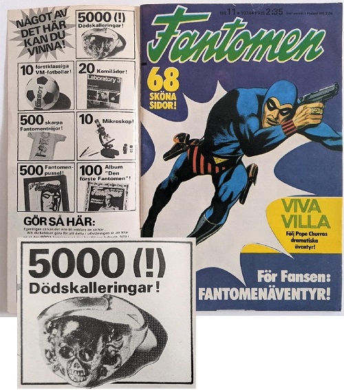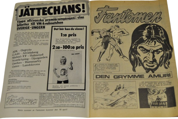 The Fantomen ‘Super Lottery’ contest was published in FantomThe first prize presented was a comprehensive trip to Germany to attend the 1974 FIFA World Cup, in which Sweden participated, encompassing two tickets to the Football World Cupen comic book number 11 by Semic Press in Sweden in 1974. To enter the competition, the reader was required to return a coupon to the publisher. This particular issue was the only Fantomen comic book to have a promotion attached to the exterior of the comic book. Below we see the comic book front cover with the contest attached.