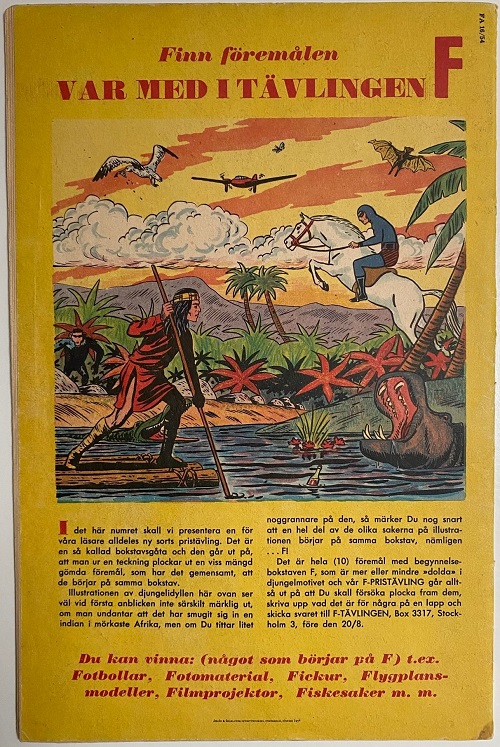 The Fantomen Find The Objects Puzzle contest was published in Fantomen comic book number 16 by Serieförlaget in Sweden in 1954. To enter the contest, the reader was required to find 10 objects within the picture starting with the letter F, found on the outside back cover of the comic, and return the answers to the publisher.