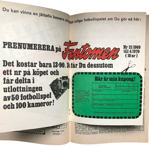 The Fantomen Camera & Soccer Game Raffle was published in Fantomen comic book number 20 by Semic Press in Sweden in 1969. To enter the raffle, the reader was required to take up a Fantomen comic subscription. This particular issue contains a card attached to the center of the comic, which was required to be completed and returned to the publisher. Below we see the comic book front cover with the card located in the center.
