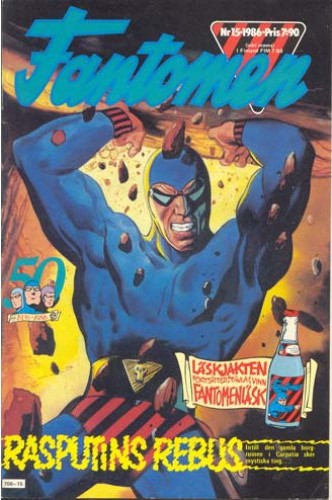 The Fantomen Soda Hunt contests were published in Fantomen comic book numbers 13 thru to 19 by Semic Press in Sweden in 1986. Fantomen Soft Drink bottles were available to be won across these 7 editions. Below we see an image of the soft drink bottle appearing on the cover of edition numbers 13, 15, 17 and 19.